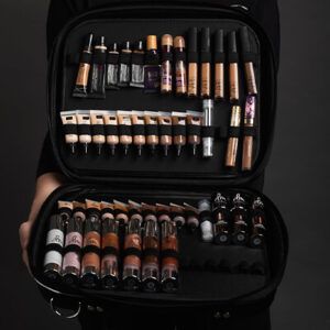 Durable, water-resistant brush bag with four compartments, clear panels, and magnetic flaps for easy access. Built for working artists.